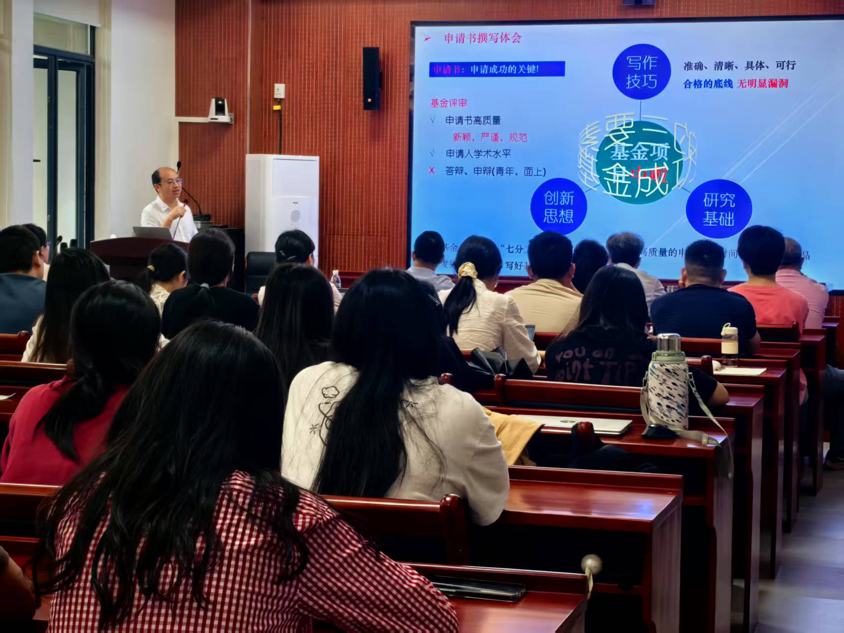 湖南师范大学曾佑林教授以“基金项目申请几点体会”为主题率先开讲,他凭借深厚的学术底蕴和丰富的课题申报经验,结合湖南省自然科学基金、省部级专项等项目类型,详解了常见基金项目申报时间节点与评审侧重点。针对基金申报“三要素”——“写作技巧、创新思想、研究基础”和课题申报书的各个板块,曾教授进行了全方位、细致入微地剖析,强调以“准、精、实、细”四字方针贯穿始终。