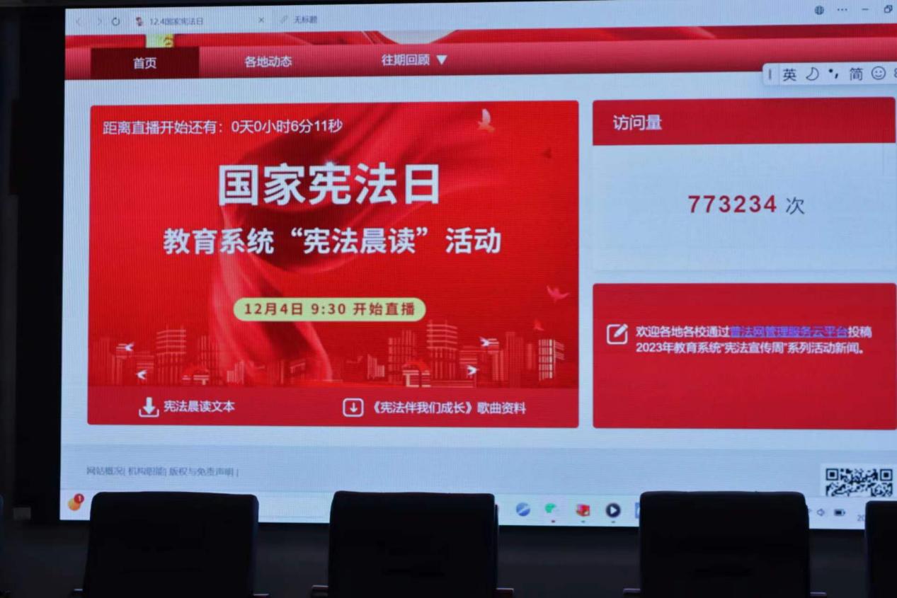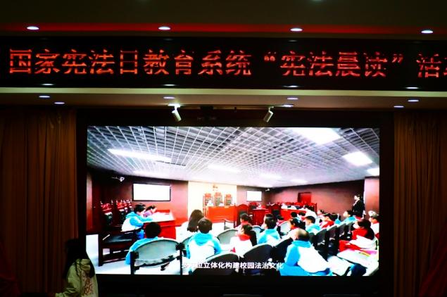 活动现场,全体师生观看教育部线上直播,跟读宪法部分条款,跟唱《宪法伴我们成长》主题曲,观看第八届全国学生“学宪法·讲宪法”全国总决赛演讲比赛选手展演。同时,各班级师生利用多媒体设备登录“全国青少年普法网”,线上同步参与全国教育系统国家宪法日“宪法晨读”直播活动。